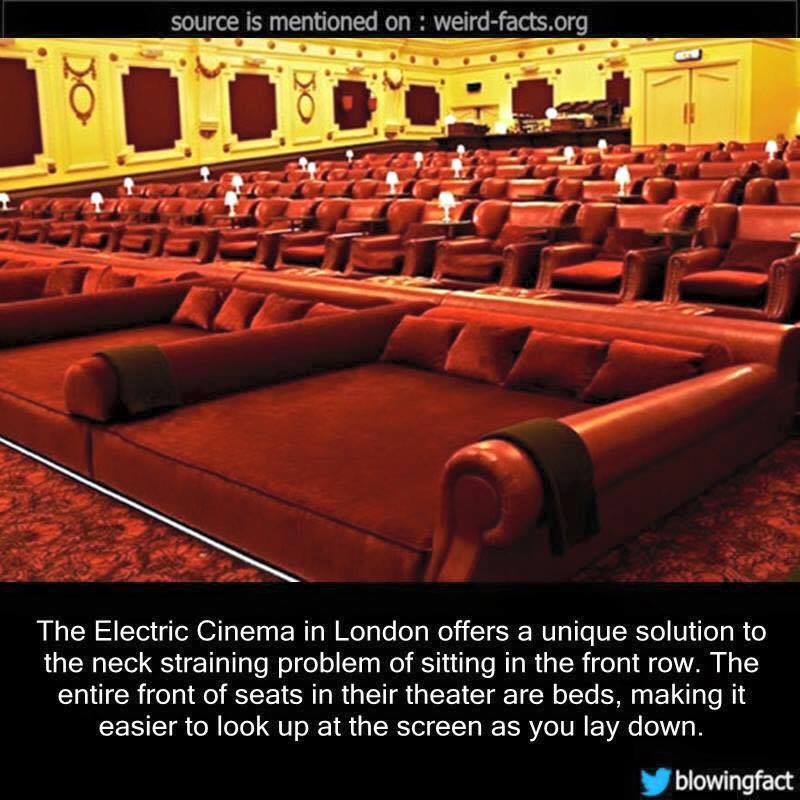 โรงภาพยนต์อิเล็คทริคซีนีม่าในเมืองลอนดอน ประเทศอังกฤษเสนอการแก้ปัญหาที่ฉีกแนวต่อปัญหาความล้าของคอในการชมภาพในแถวหน้าสุด เก้าอี้แถวหน้าสุดของโรงภาพยนต์แห่งนี้เปลี่ยนเป็นเตียงแทน เมื่อเวลาคุณนอนลงทำให้ง่ายต่อการมองไปที่จอภาพยนต์