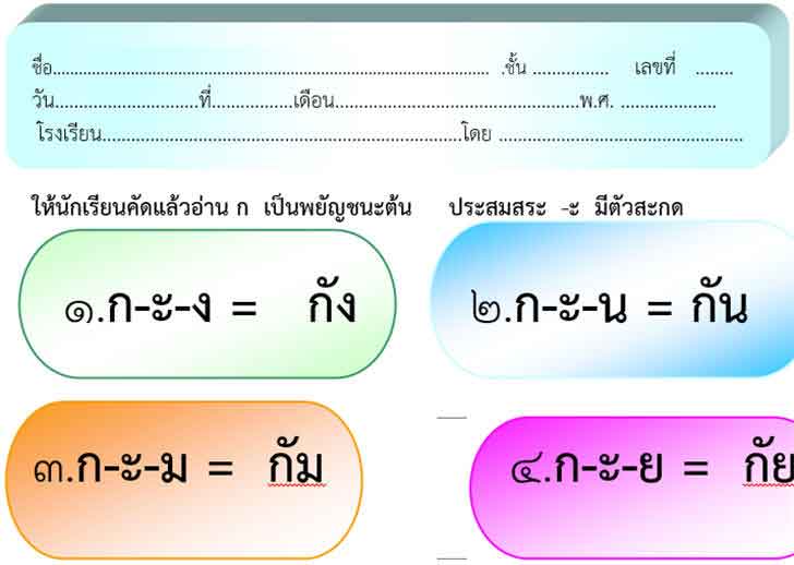 ฟรีสื่อการเรียนการสอน คัดแล้วอ่าน ก เป็นพยัญชนะต้น ประสมสระ -ะ มีตัวสะกด